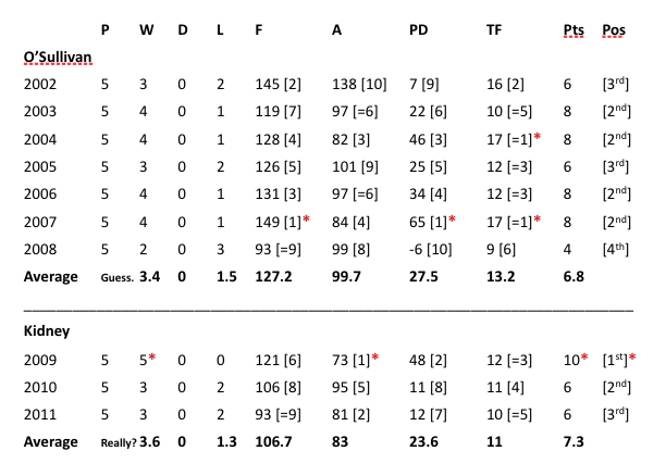 - O’Sullivan’s teams averaged over 127 points per championship, or 25.4pts/game. Kidney’s teams have averaged just 107 points per championship, or 21.4pts/game. That’s a 20pts/championship and 4pts/game advantage in EO’S teams’ favour.