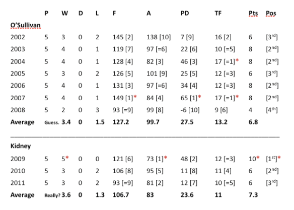 - Kidney’s team average a concession of 83pts/championship for 16.6pts/game, as opposed to O’Sullivan’s 99.7pts/championship for 19.9pts/game – that’s a 16.7pts/championship swing [and a 3.3pts/game swing] in Kidney’s favour.