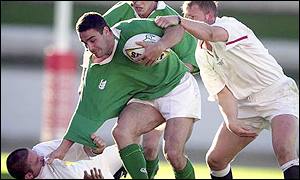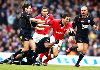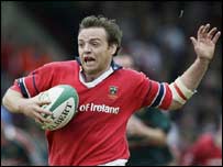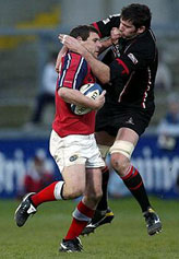 Staunton tries to break free against Neath in the Celtic League Final, February 2003. Munster won 37-17, with Staunton kicking two penalties and two conversions when O’Gara went off injured.