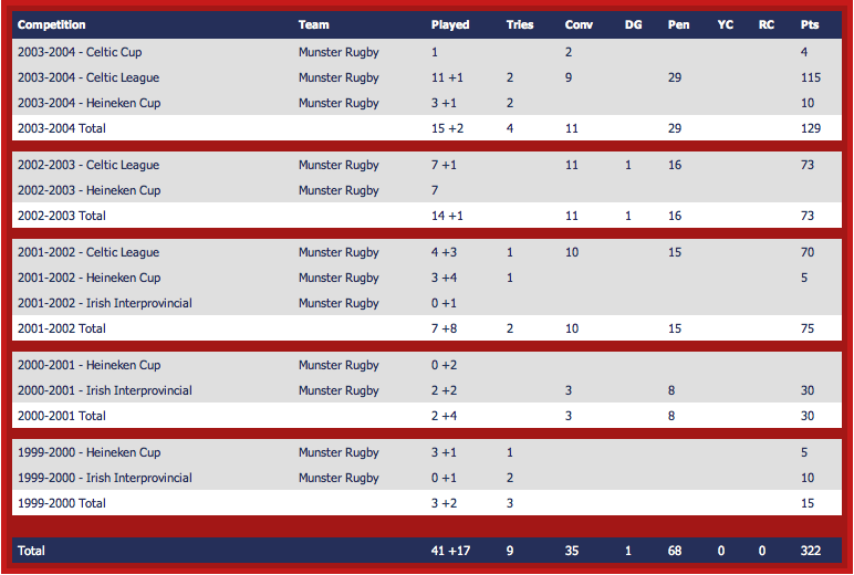 Jeremy Staunton’s career at Munster [click to embiggen]: he got a fair whack of gametime once Gaffney was installed as head coach and the Celtic League swung into action, but the arrival of Christian Cullen put the kibosh on his days as Munster fullback. After two seasons where Rob Henderson had been a bit part player through injury, he was able to put together an 18-start, 6-try season for Munster in the centre in 2003-04 … and so all of a sudden the No12 jersey looked like it was sewn up for the foreseeable future as well.