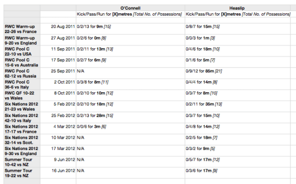 Irish matches from the 2011-12 season in which O’Connell and/or Heaslip have started. Heaslip’s stats from the Russian game in RWC11 are very eye-catching, but more or less irrelevant. The Mole thinks that it’s more interesting to see the number of games in which they have played together where the second-row gets on the ball more often than the No8. If you look at the number of passes both men make and the average metres/carry, there’s also a significant discrepancy.