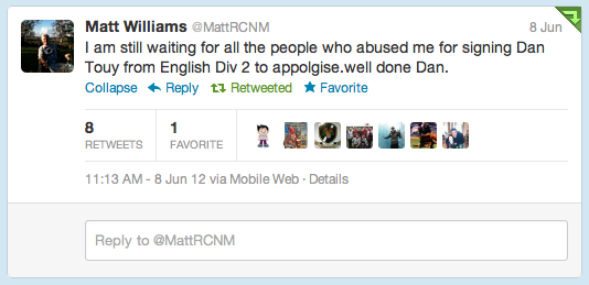 Matty Williams gives the begrudgers both barrels in a classic, well-earned feat of Matt pique on Twitter [click to embiggen]. You tell ’em, Matty! The Mole isn’t sure how many of the abusers got in touch with him … sure we don’t even know if Ryan Caldwell is on Twitter!