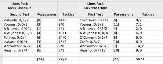 Lydiate had the ball four times in open play, Warburton had it four times, and Heaslip had it six times, with only the No8 breaking 10m with the ball in hand. Those are low numbers for tight five forwards, never mind back rowers. In the first test, Croft got on the ball ten times, Warburton three times and Heaslip twenty – it reflected a far more rounded [and effective] gameplan.
