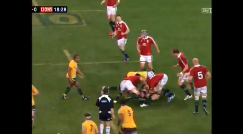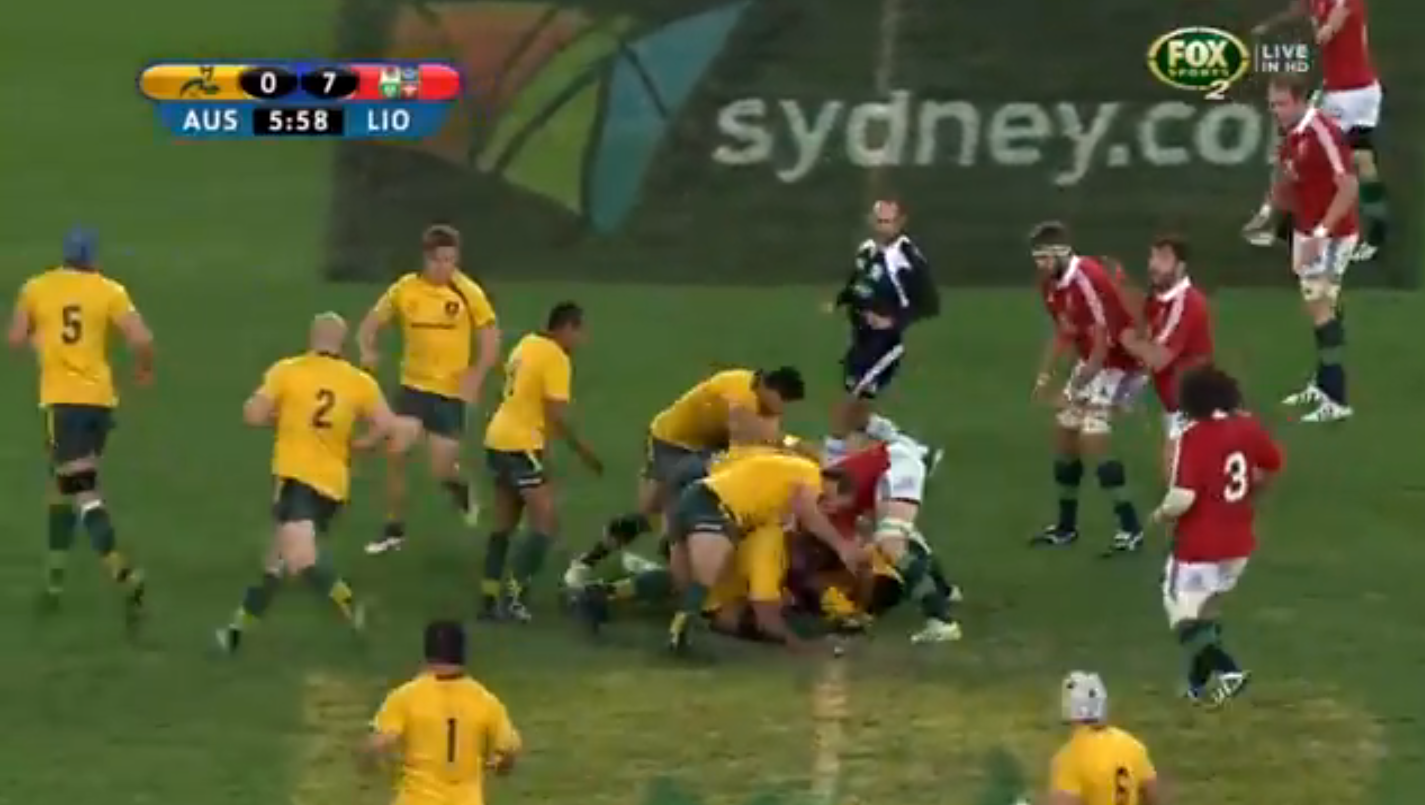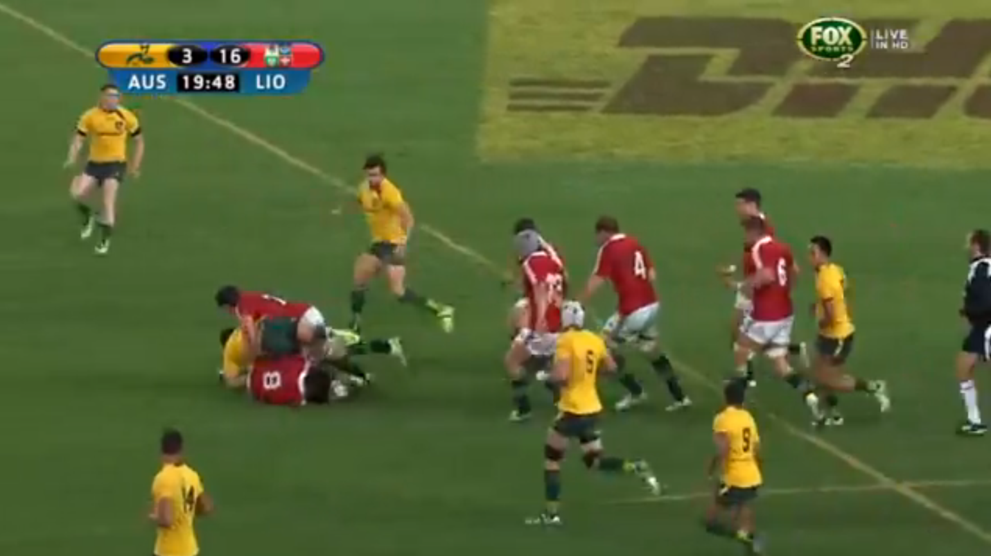First Test, Ruck 48, 18:28* on the match clock. Jamie Heaslip [red jersey and blue boots] goes in for a strong attempt at the jackal, but is blasted out of it by Ben Mowen [white scrum-cap]. That’s 3pts for Heaslip, as an unsuccessful jackal is equivalent to a hit. It’s probably just as well he was bashed out of the way, as referee Pollock decided to play by his own personal laws of the game that day, and the Lions didn’t win a single ball over 80 minutes through jackalling. *The match clocks for the Australian and Sky broadcasts weren’t in sync for the first test; hence you had Sky’s clock showing that there was still time to play after Kurtley Beale’s last chance miss.