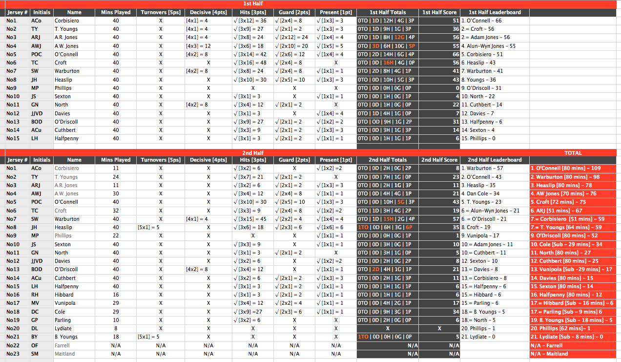 Ruck Marks, Lions 1st test vs Australia [click to embiggen]. This seems self explanatory enough, having looked at it for about nine hours, but it’s obviously not. The first of the columns in dark grey shows the accumulated ruck actions of each player in each half [i.e. 1 turnover, 2 decisives, 3 hits, 4 guards, 5 presents] and an orange highlight shows that a player led the team in a particular action [i.e. a hit] in the half. The second of the two grey columns shows the total weighted score per half [from the example cited above, 1×5 + 2×4 + 3×3 + 4×2 + 5×1 = 35]. The white column to the right of this shows a leaderboard for each half, and the red column shows the overall ruck mark for each player as a leaderboard over the entire game.
