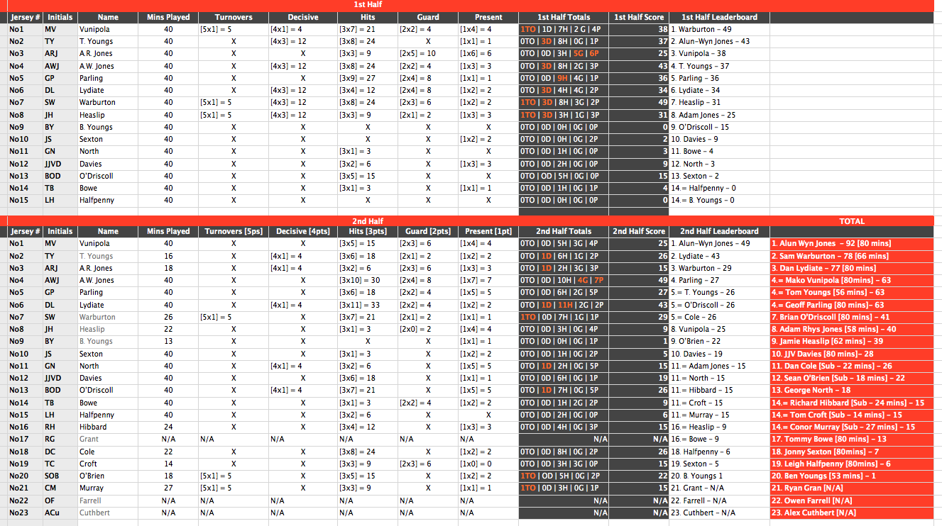 The only useful stat that I can think of that you haven’t included (but easily could) is number of rucks that occurred while each player was on the pitch. You give the numbers from each match, so it can be calculated for any player that was on the pitch for 80 minutes, but not for those that were replaced/replacements.