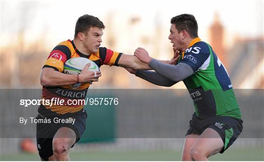 Jamie Heaslip gets stuffed by Connacht's Bundee Aki.