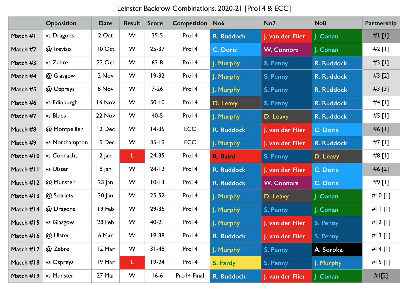 Leinster picked seven different players to fill the No8 jersey over the course of 19 games. Despite having three test-capped No8s in the squad, Rhys Ruddock – a blindside by trade – ended up starting there most often. The bigger emphasis on ball-carrying as an ocho tied in well with his off-season decision to focus on becoming lighter and more powerful, and an early season run of games saw him build up considerable momentum in his charge to regain a place in the Irish backrow.