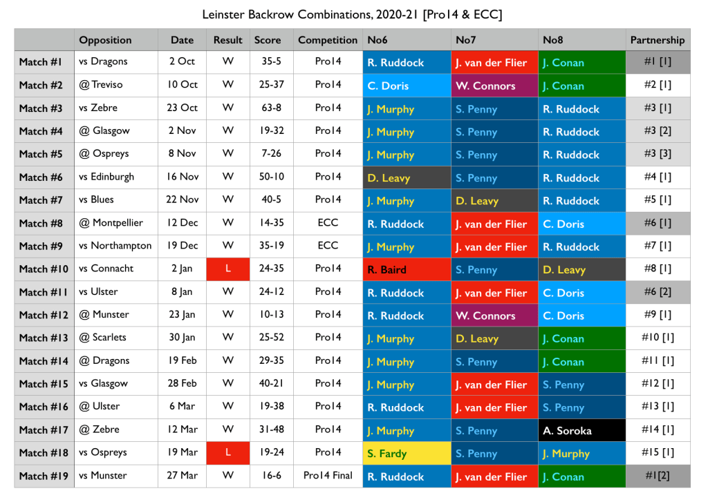 Leinster’s 2020-21 backrow by gametime [click to embiggen]. Doris, Deegan and Connors, the top three in terms of gametime last season, slipped to the bottom of the charts this time out, propped up by a couple of Academy Year 1 prospects. This was exclusively due to injury with regards to Deegan, a mix of injury and international duty for Doris, and a heavy dose of international duty with a side order of injury for Connors.