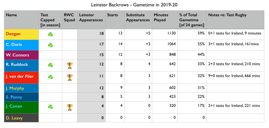 Leinster’s 2019-20 backrow by gametime [click to embiggen]. Max Deegan and Caelan Doris led the way, and were rewarded for their form with Six Nations caps in February. Will Connors would have to wait eight months but he too would win his first cap in the same tournament. Jack Conan, on the other hand, didn’t play a single game of rugby for almost exactly 11 months following his injury at the World Cup. He had it easy compared to Dan Leavy, who missed 18 months of the middle of his career.
