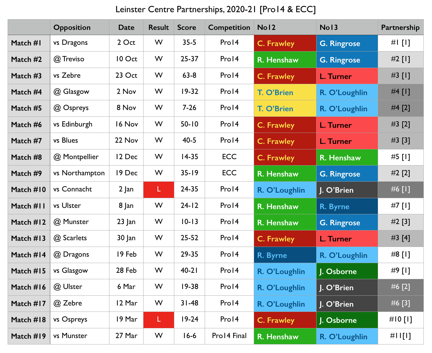 Leinster struggled to put a midfield together all season.  Over the 19 games from the start of October until the end of March, 11 different centre partnerships were selected to start; this doesn’t take into account the ad hoc combinations that sprung up in-game due to injury or substitution.